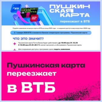 Муниципальное казённое учреждение «Информационно-методический центр» Татарского муниципального округа Новосибирской области сообщает что, с 01.01.2026 оператором программы «Пушкинская карта» становится Банк ВТБ (ПАО).
